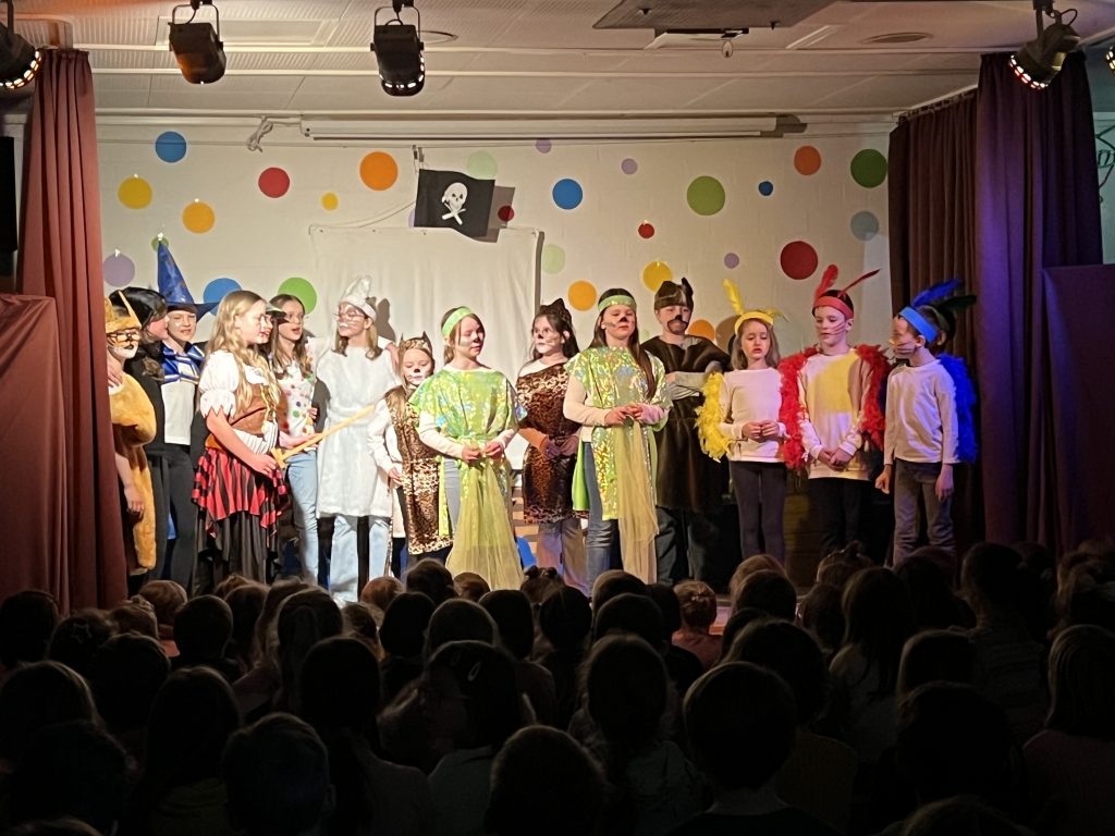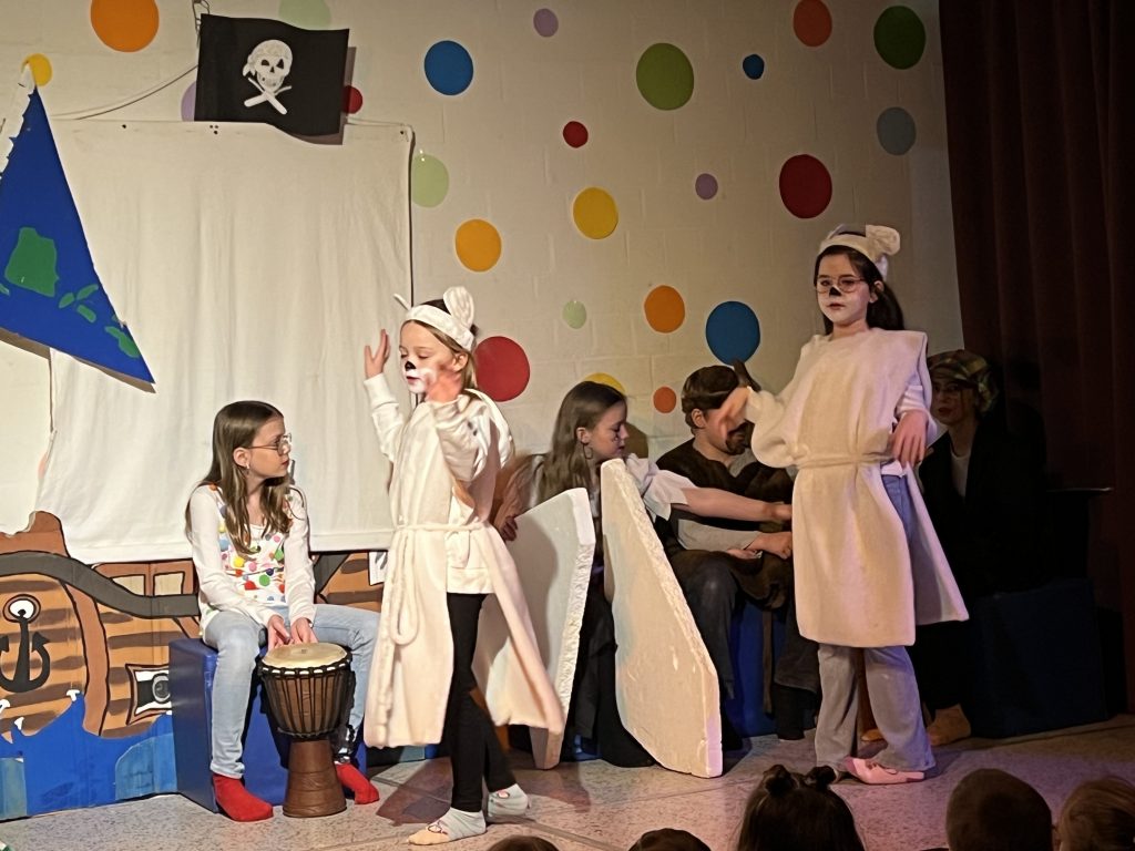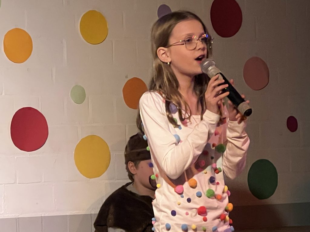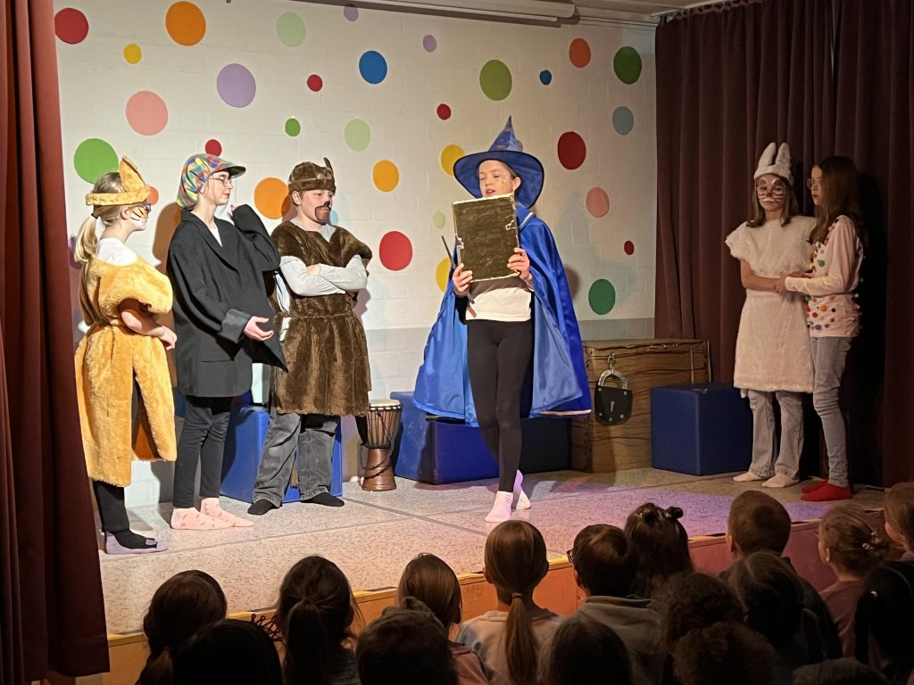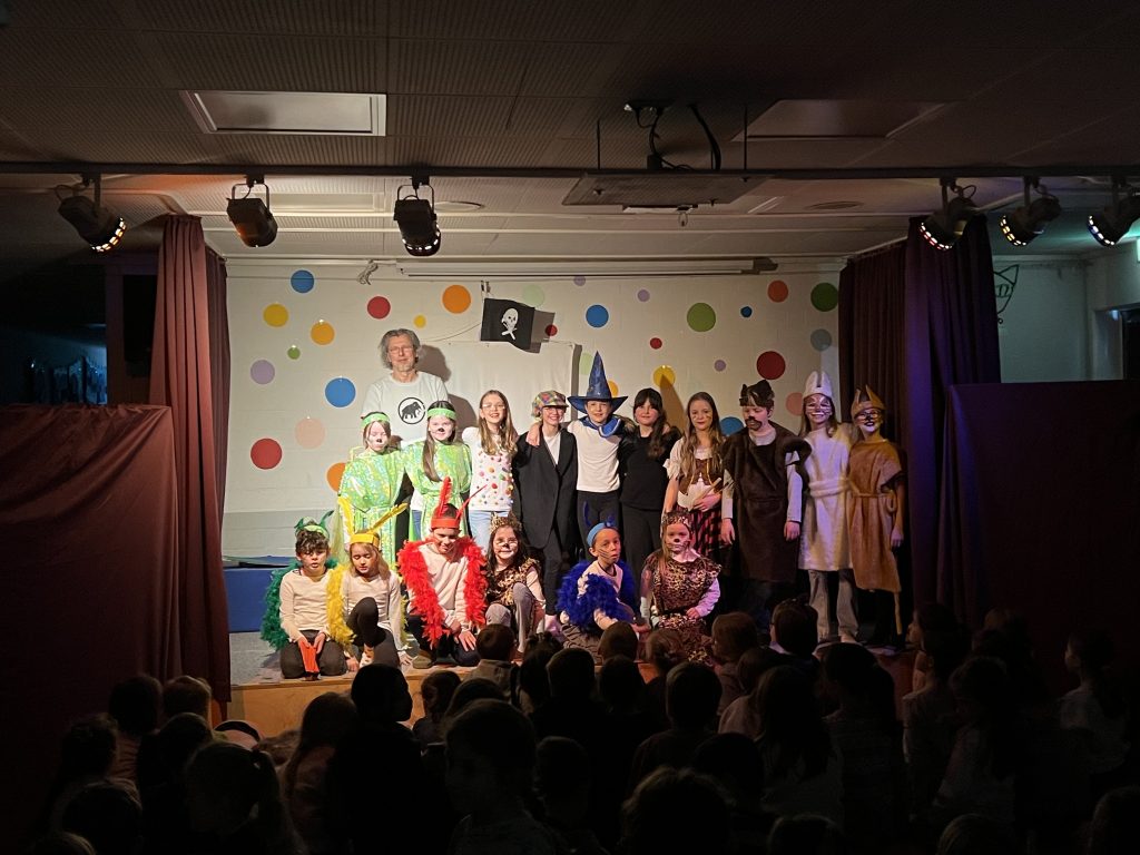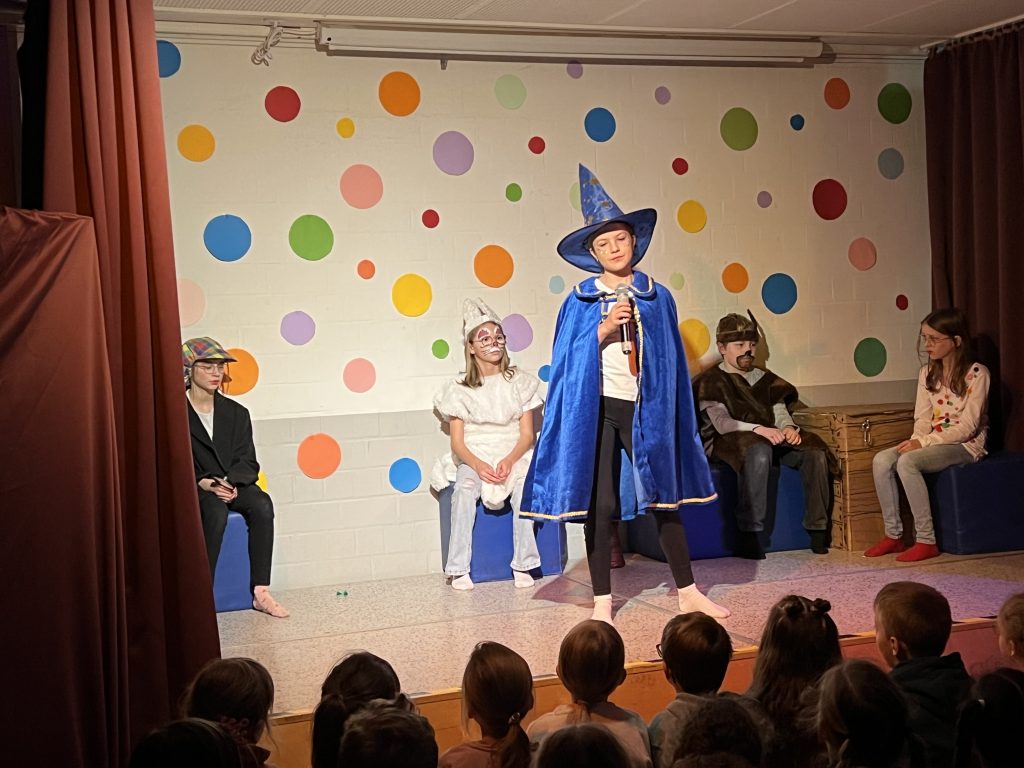 Mit großer Begeisterung präsentierte die Theater-AG unter der Leitung von Herrn Schmitz ihr diesjähriges Minimusical Felicitas Kunterbunt – und erntete dafür tosenden Applaus. Wochenlang hatten die Kinder mit viel Einsatz und Herzblut geprobt. Das Ergebnis war eine rundum gelungene Aufführung mit mitreißenden Liedern, schwungvollen Tanzchoreographien und beeindruckend mutigen Solobeiträgen.