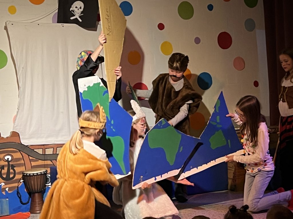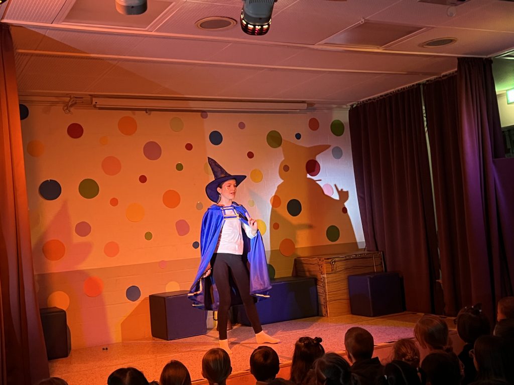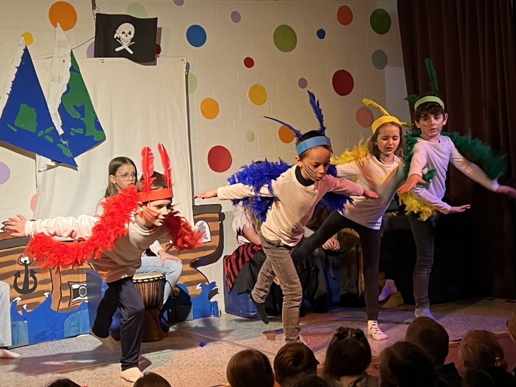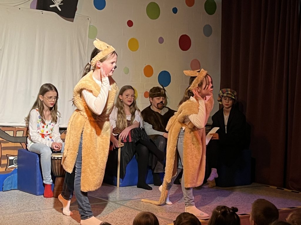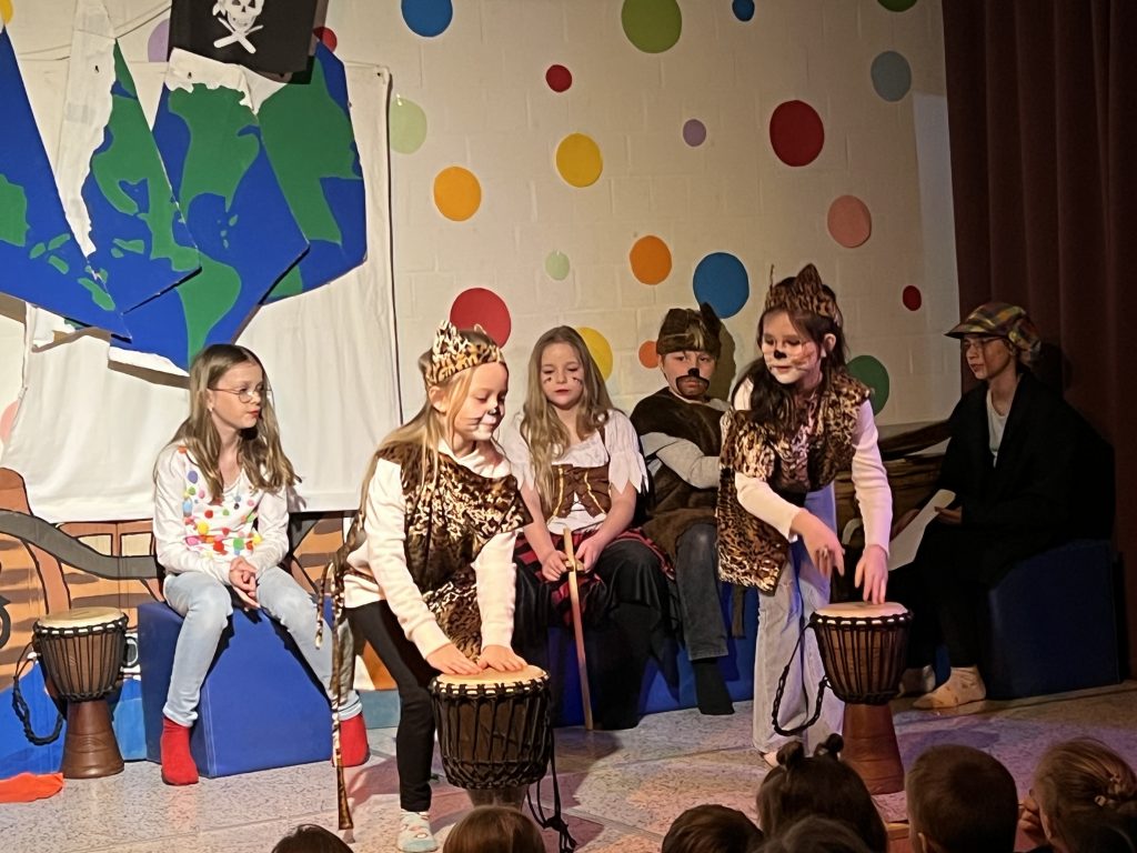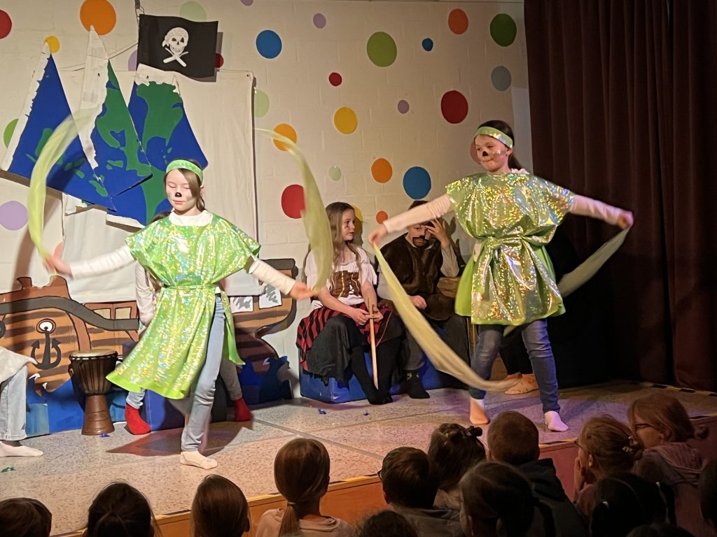 Mit großer Begeisterung präsentierte die Theater-AG unter der Leitung von Herrn Schmitz ihr diesjähriges Minimusical Felicitas Kunterbunt – und erntete dafür tosenden Applaus. Wochenlang hatten die Kinder mit viel Einsatz und Herzblut geprobt. Das Ergebnis war eine rundum gelungene Aufführung mit mitreißenden Liedern, schwungvollen Tanzchoreographien und beeindruckend mutigen Solobeiträgen.